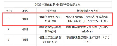 近日,福建省工业和信息化厅正式发布《2025年福建省新材料新产品公示名单》,福建永荣锦江股份有限公司(以下简称“永荣股份”)自主研发的免染消费后再生锦纶6纤维爱赛纶E-SUNLON®(16.5dtex/7F FDY)凭借其创新性、环保性及技术突破性,成功入选福建省新材料新产品名单。