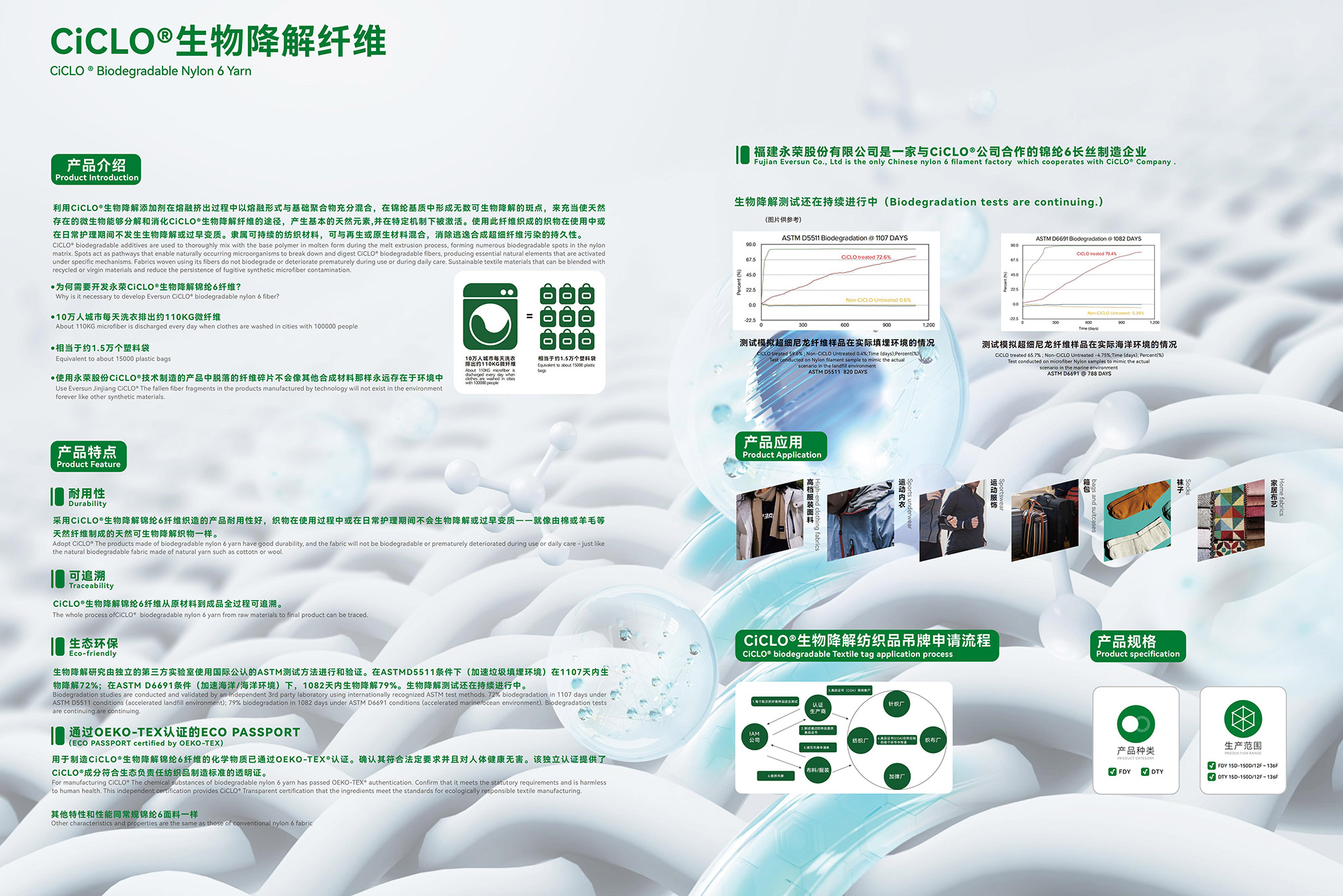 利用CiCLO®生物降解添加剂在熔融挤出过程中以熔融形式与基础聚合物充分混合,在锦纶基质中形成无数可生物降解的斑点,来充当使天然 存在的微生物能够分解和消化CiCLO®生物降解纤维的途径,产生基本的天然元素,并在特定机制下被激活。使用此纤维织成的织物在使用中或 在日常护理期间不发生生物降解或过早变质。隶属可持续的纺织材料,可与再生或原生材料混合,消除逃逸合成超细纤维污染的持久性。